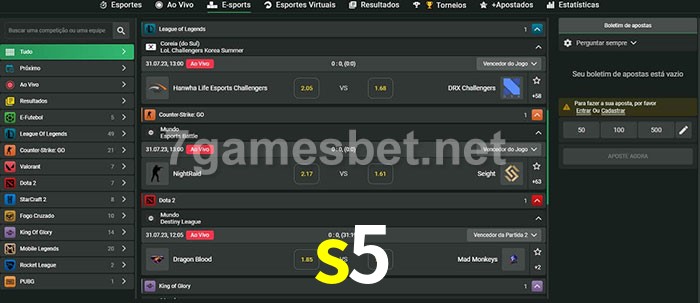 O s5 oferece uma grande seleção de opções de apostas em e-sports com probabilidades competitivas